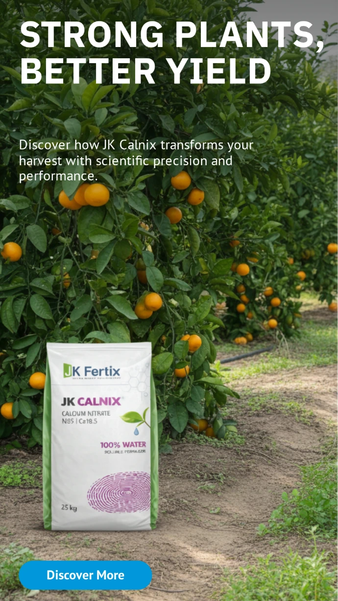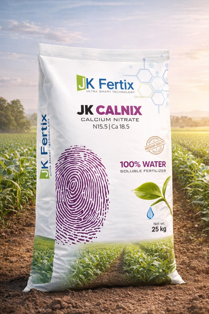 JK CALNIX a high-quality, water-soluble source of Calcium and Nitrogen that strengthens plant cell walls, improves fruit setting, and enhances post-harvest durability. Ideal for continuous use throughout the crop growth cycle via fertigation or hydroponics. It quickly corrects calcium deficiency, improves crop quality, and increases shelf life of fruits and vegetables