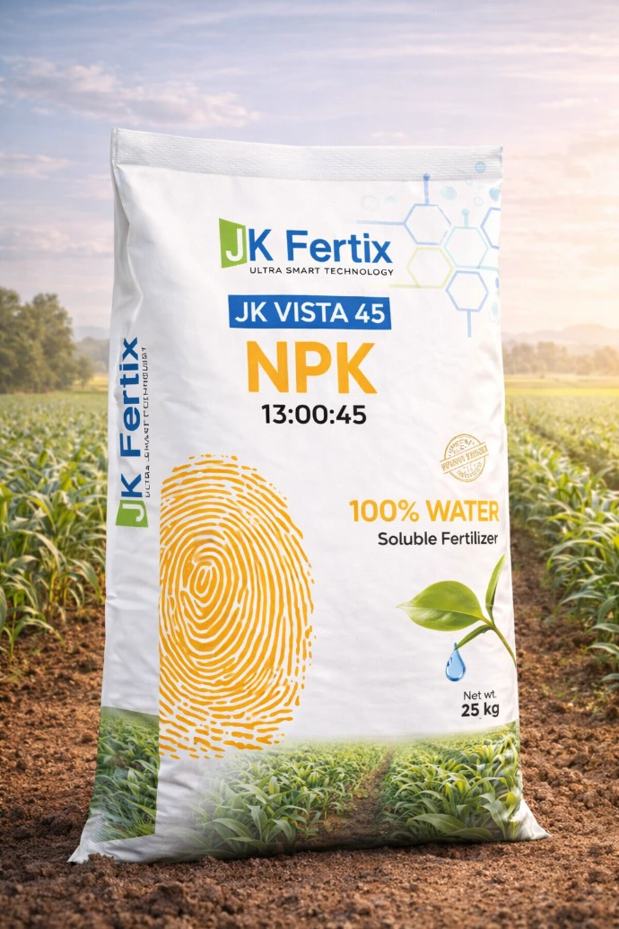 is a high-quality, fully water-soluble NPK fertilizer specially formulated with high Potassium content (45%) to support flowering, fruit development, crop maturity, and overall plant strength. It is ideal for foliar spray and fertigation, ensuring rapid nutrient absorption and efficient utilization by crops.